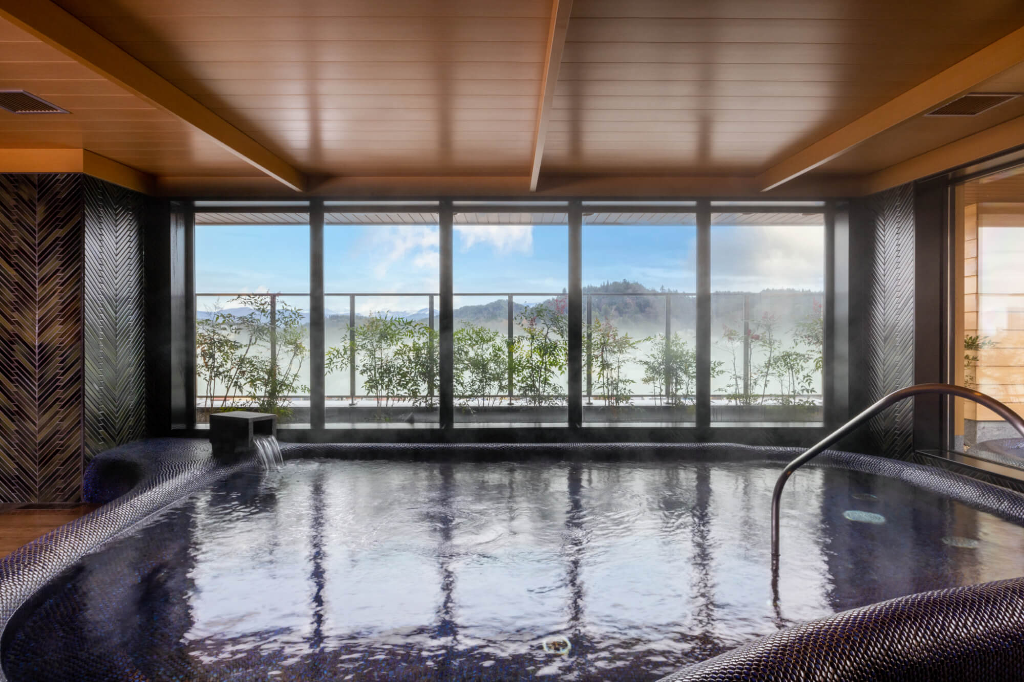 湯気の向こうに広がる日本的な素材使いと洗練された癒しの空間。室内温泉での時間が、日々の疲れを癒やします。